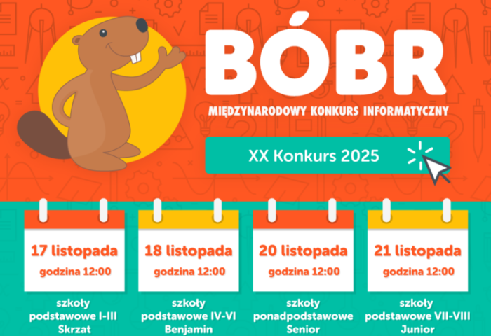 Zachęcam do udziału w Międzynarodowym Konkursie Informatycznym Bóbr 2025 Wszelkie informacje dotyczące konkursu można znaleźć na stronie http://www.bobr.edu.pl/ Konkurs jest bezpłatny. Konkurs jest przeprowadzany w kategoriach: Skrzat – dla uczniów klas I-III szkół podstawowych, Beniamin – dla uczniów klas IV-VI szkół podstawowych, Junior – dla uczniów klas VII-VIII szkół podstawowych.