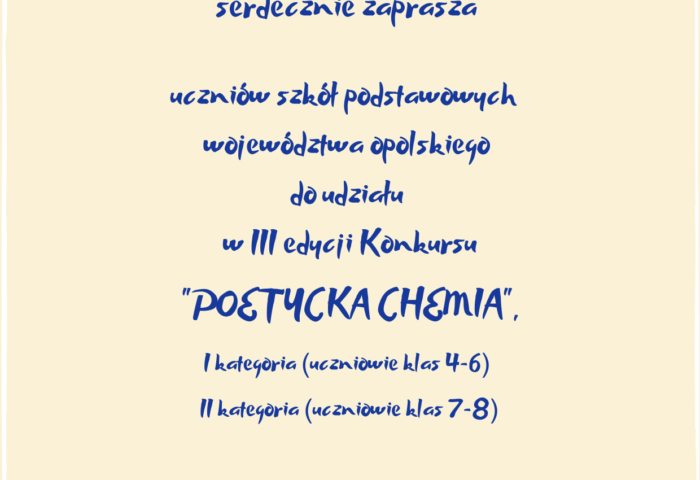 Zapraszamy uczniów klas siódmych i ósmych szkół podstawowych do udziału w III edycji międzyszkolnego konkursu „POETYCKA CHEMIA” o zasięgu wojewódzkim, który odbywa się pod patronatem Wydziału Chemii Uniwersytetu Opolskiego. TERMIN ZGŁOSZEŃ UPŁYWA 20 kwietnia 2023r. Z wyrazami szacunku Iwona Gmoch-Buczek Paulina Marcinkowska Publiczna Szkoła Podstawowa nr 14 im. Adama Mickiewicza w Opolu Regulamin konkursu: MIĘDZYSZKOLNY […]