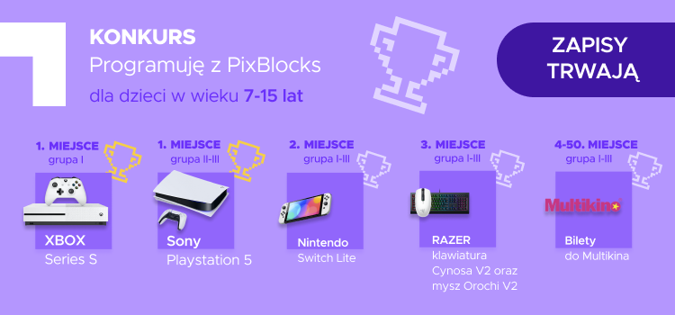 Jednocześnie informujemy, że zostały przedłużone zapisy do KONKURSU Programuję z PixBlocks „PixChallenge 2023/2024” dla dzieci w wieku 7-15 lat.