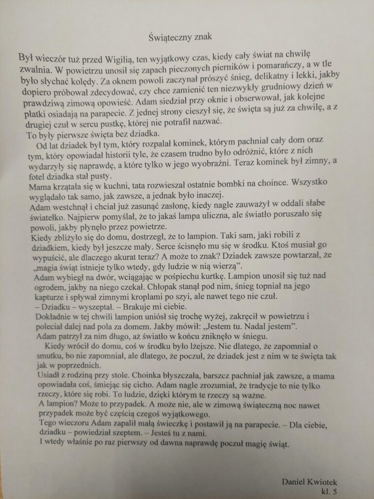 I Miejsce: Daniel Kwiotek (klasa V) – za niezwykłą wyobraźnię i stworzenie niepowtarzalnego klimatu opowieści.