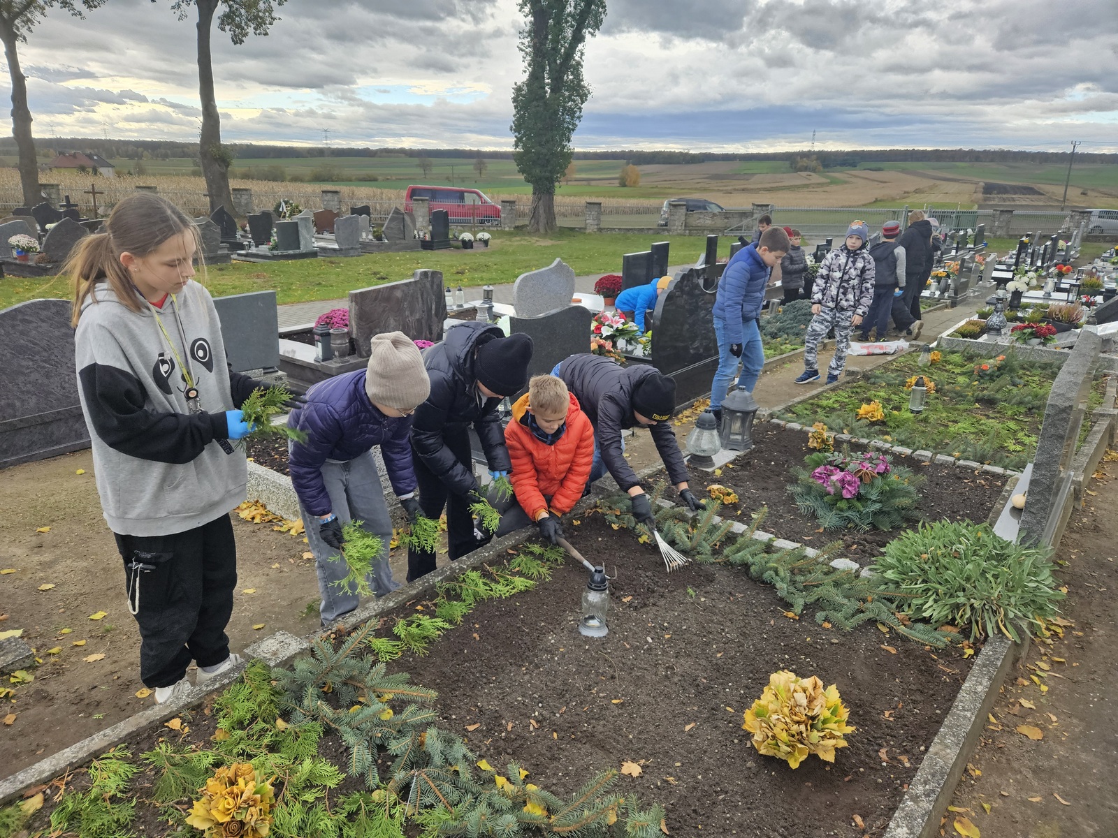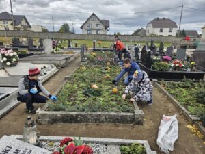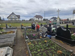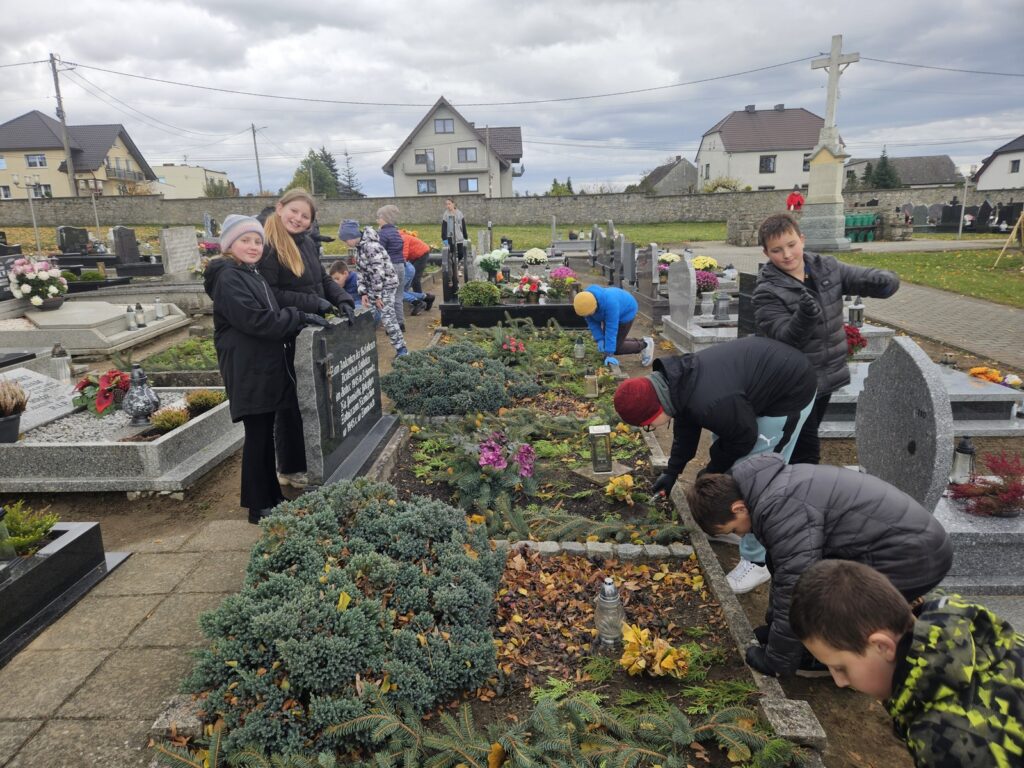 W ramach przygotowań do uroczystości Wszystkich Świętych uczniowie naszej szkoły odwiedzili pobliski cmentarz. Wspólnie posprzątaliśmy groby, zapaliliśmy znicze i pomodliliśmy się za zmarłych. Uczniowie klasy 6 zrobili bukiety z liści klona, a uczniowie klasy 5 przystroili groby żołnierzy poległych zielonymi gałązkami i bukietami kwiatów.