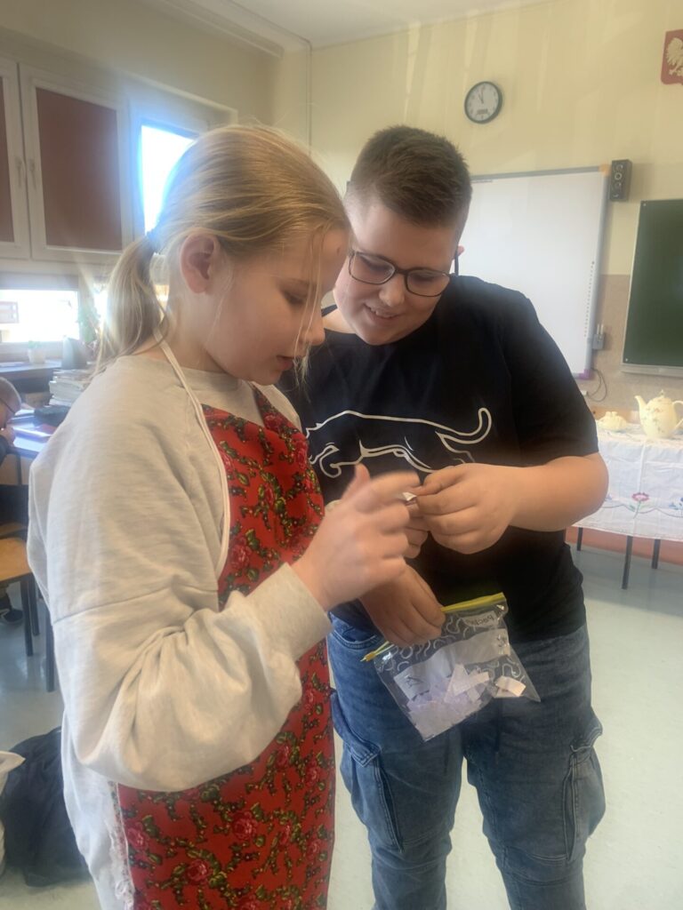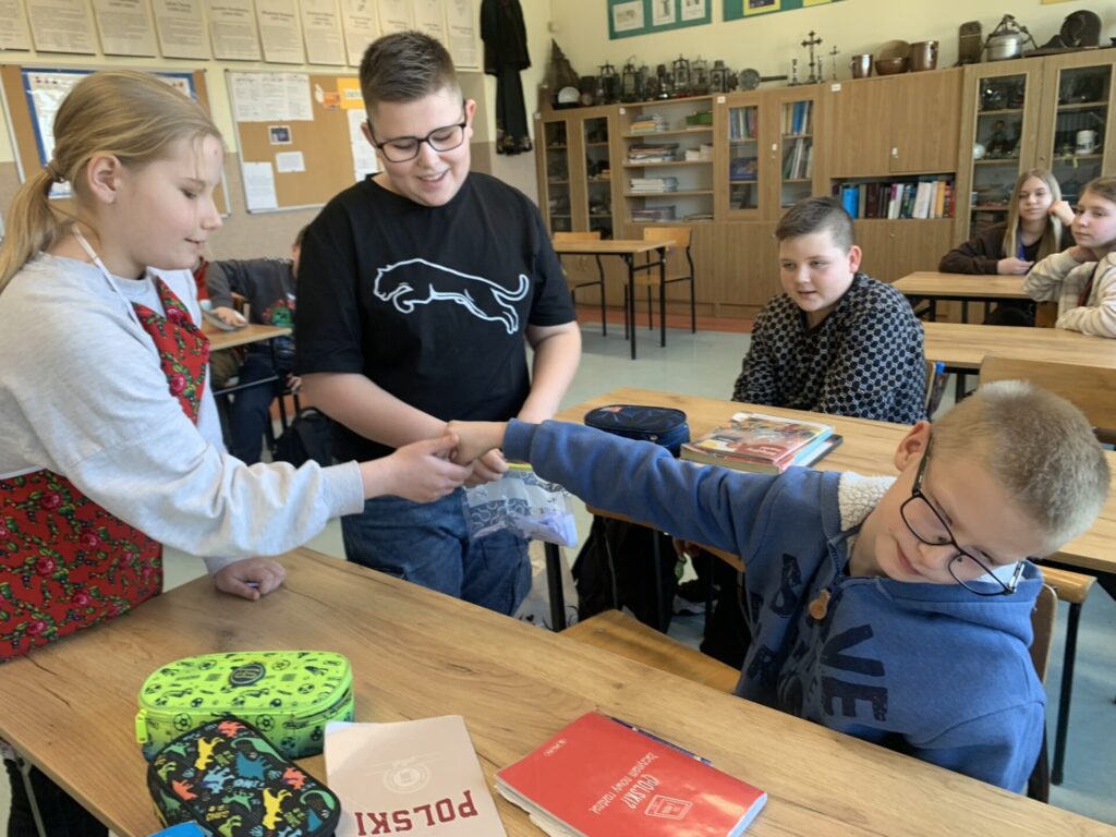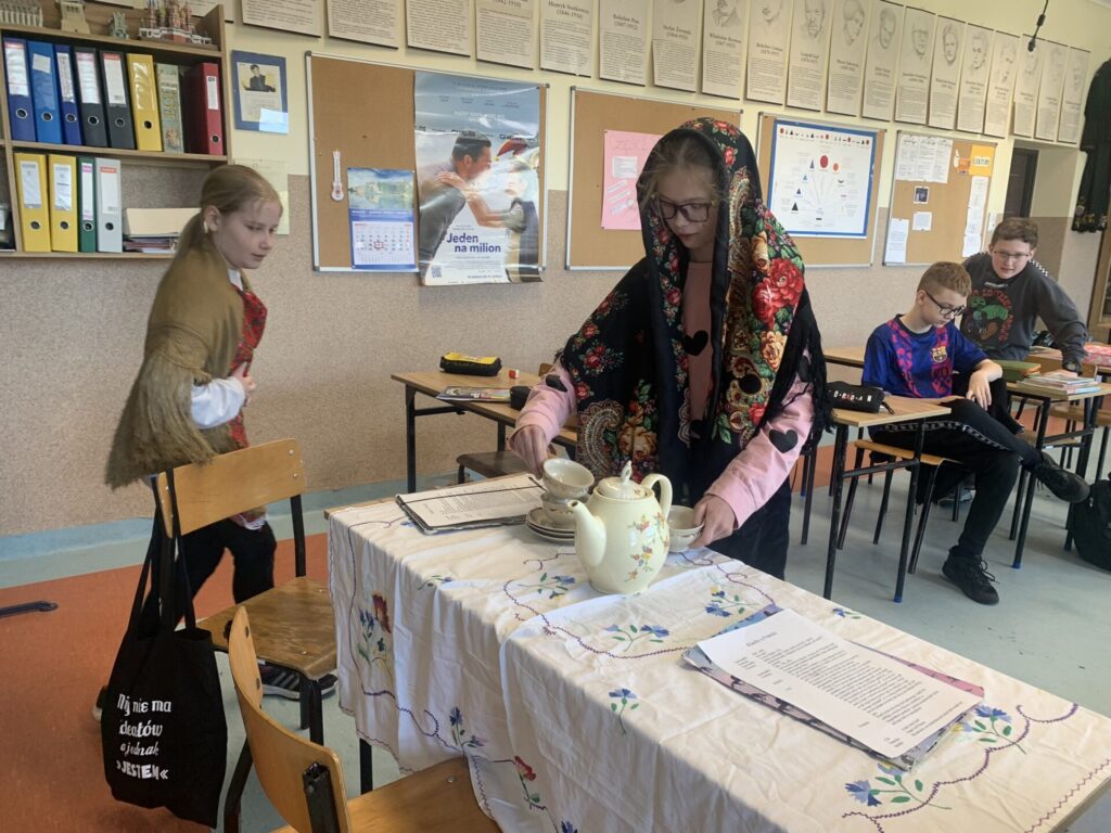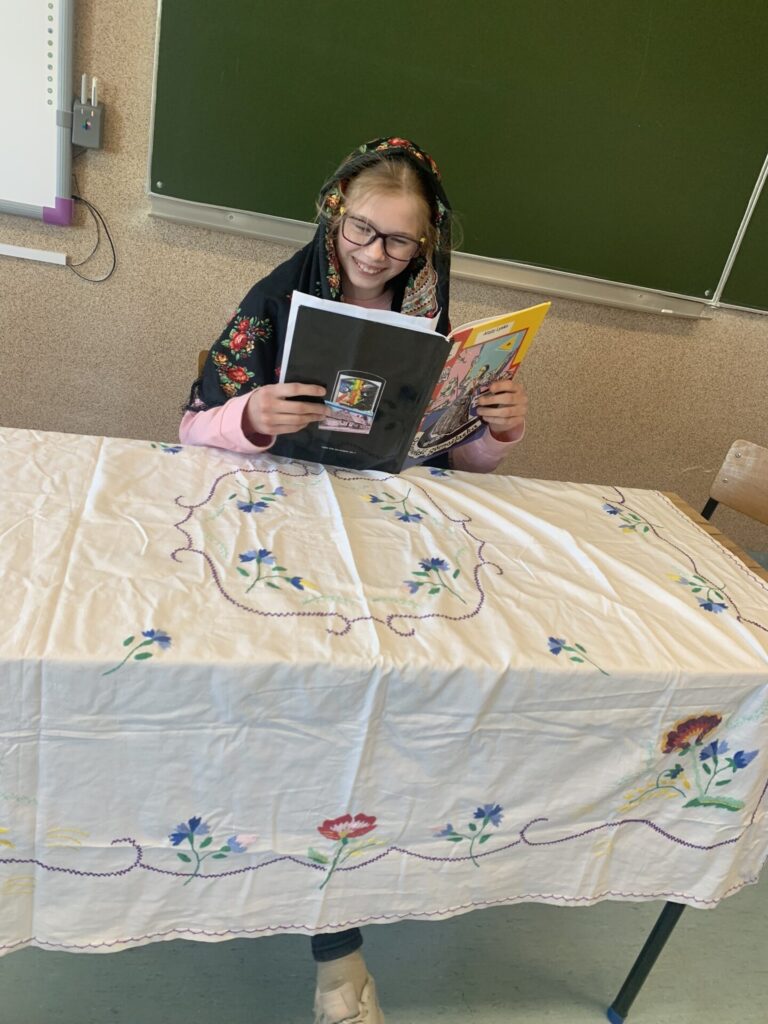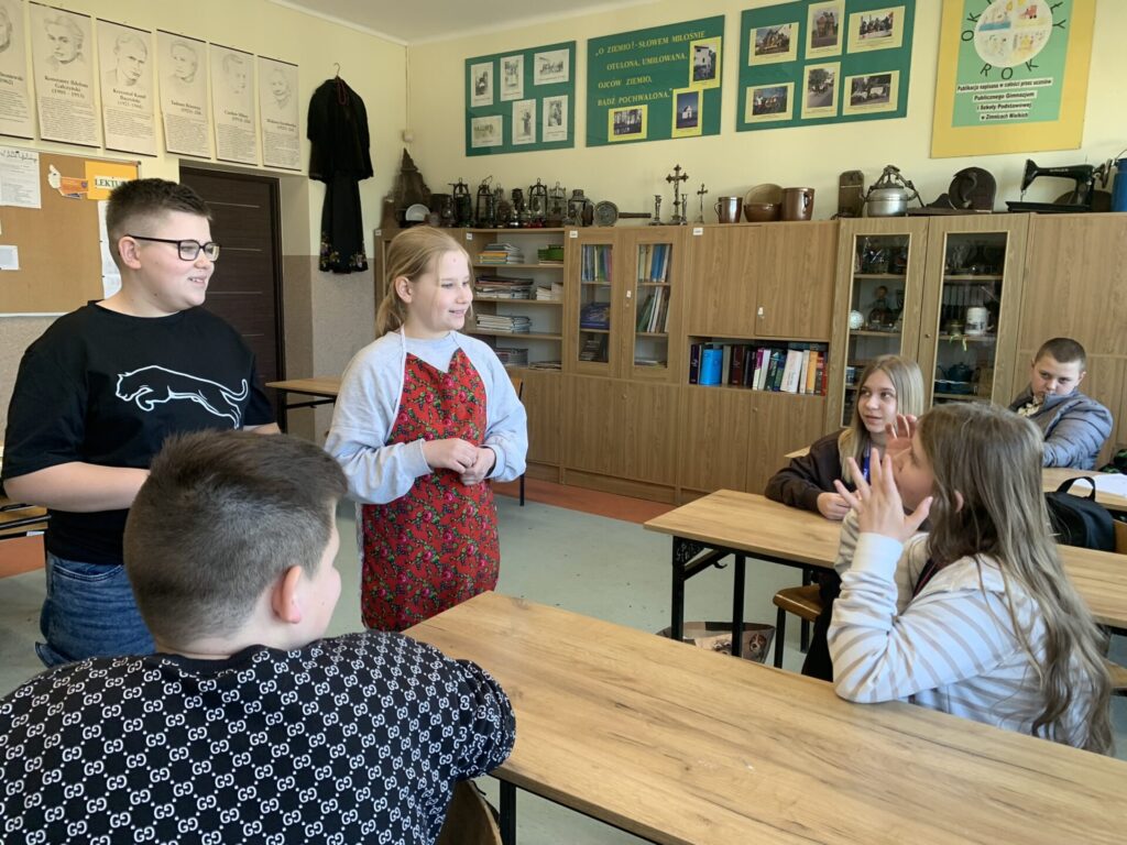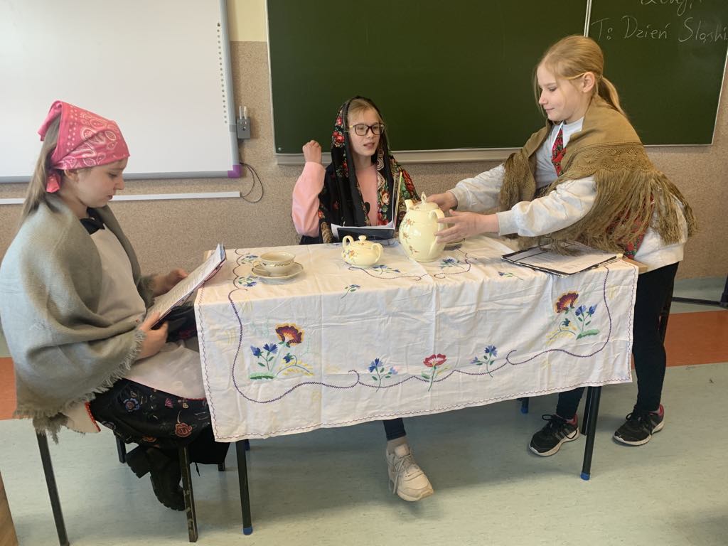 Ileż radości może przynieść rozprawianie po śląsku na języku polskim! Przekonała się o tym klasa 5. Były klachy u Francki przy kafeju, test ze znajomości gwary śląskiej, opowieści o maślniczce, blaszanej misce i nudelkuli, o taśce i zapasce, konkurs na rozumienie słów śląskich. Uczniowie dowiedzieli się ze zdjęć, jak kiedyś wyglądał strój panny młodej i jak dużą wartość miał kiedyś rower, czyli koło. Zobaczyli też pamiątkową widokówkę, która ma dziś już siedemdziesiąt lat. Prawie wszyscy zaangażowali się w przygotowanie tej ciekawej i wyjątkowej lekcji, a przy tym świetnie się bawili. Doszliśmy do wniosku, że z gwarą warto być za pan brat.