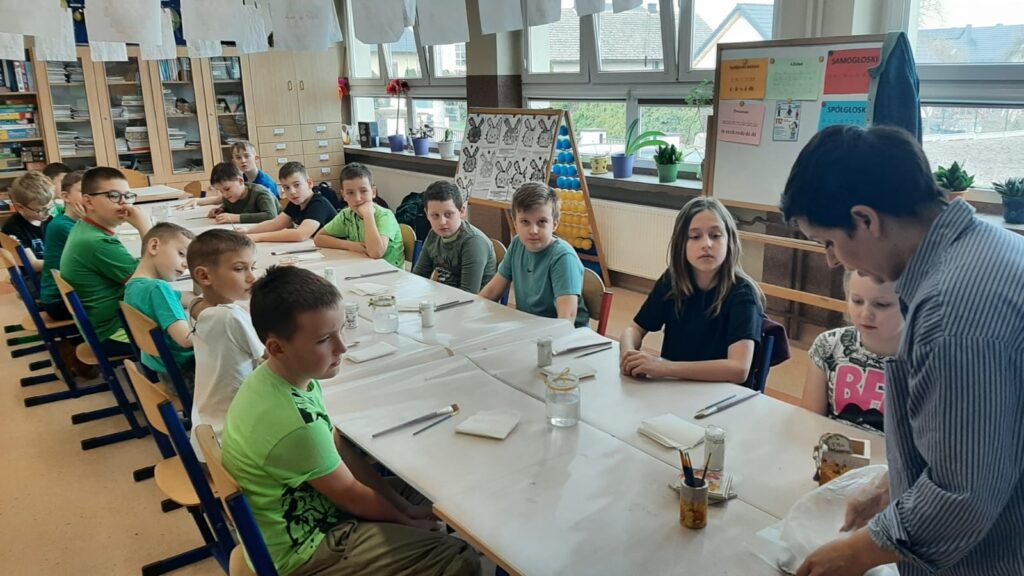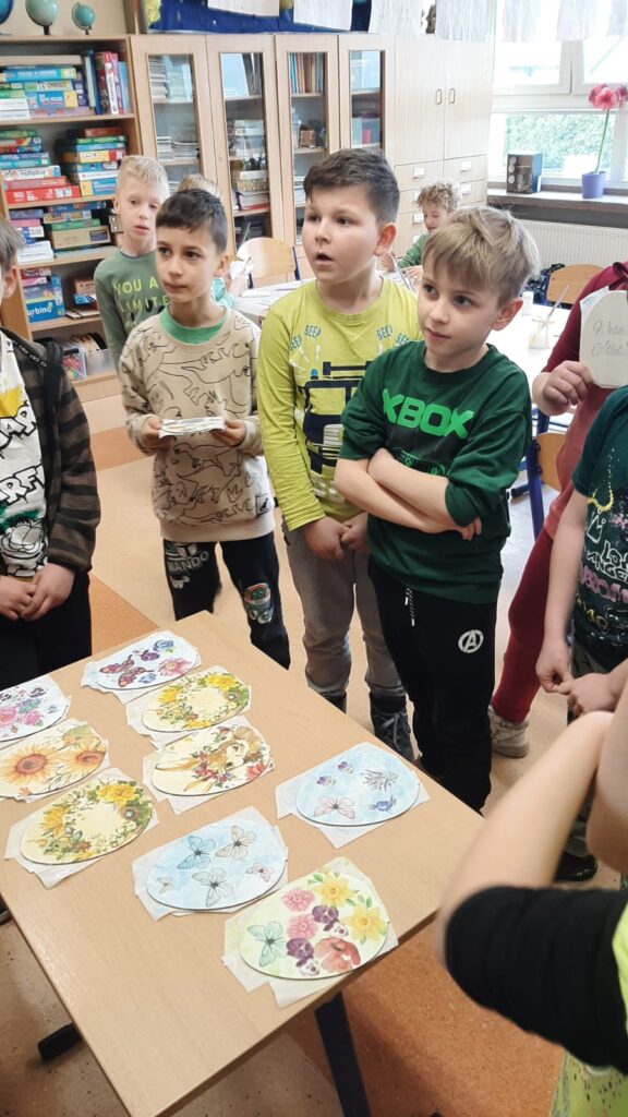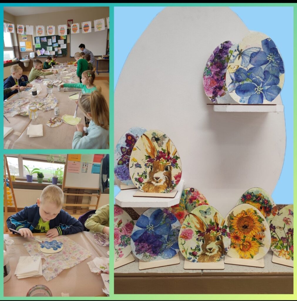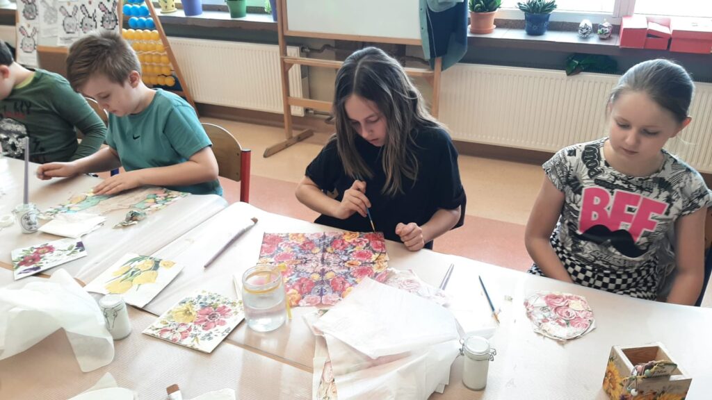 W dniu 15 marca 2024 r. nasi uczniowie z klas I-III poczuli już nastrój nadchodzących świąt wielkanocnych. Uczestniczyli oni bowiem w warsztatach artystycznych, na których metodą decoupage tworzyl