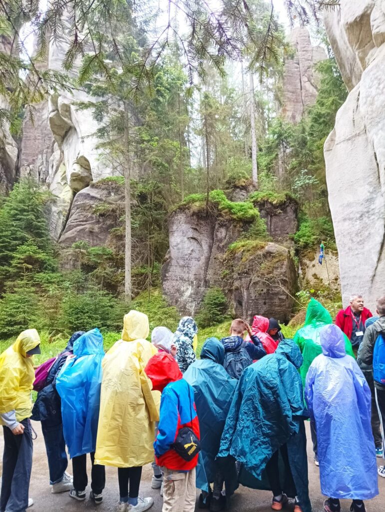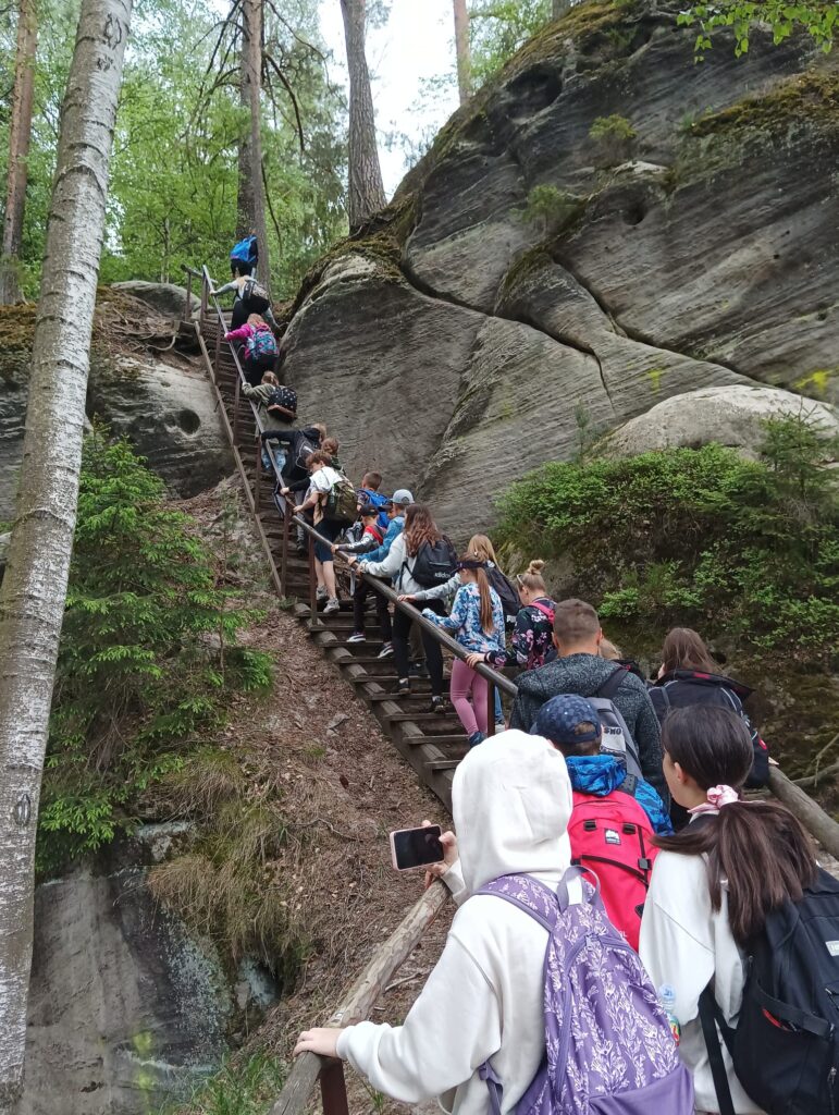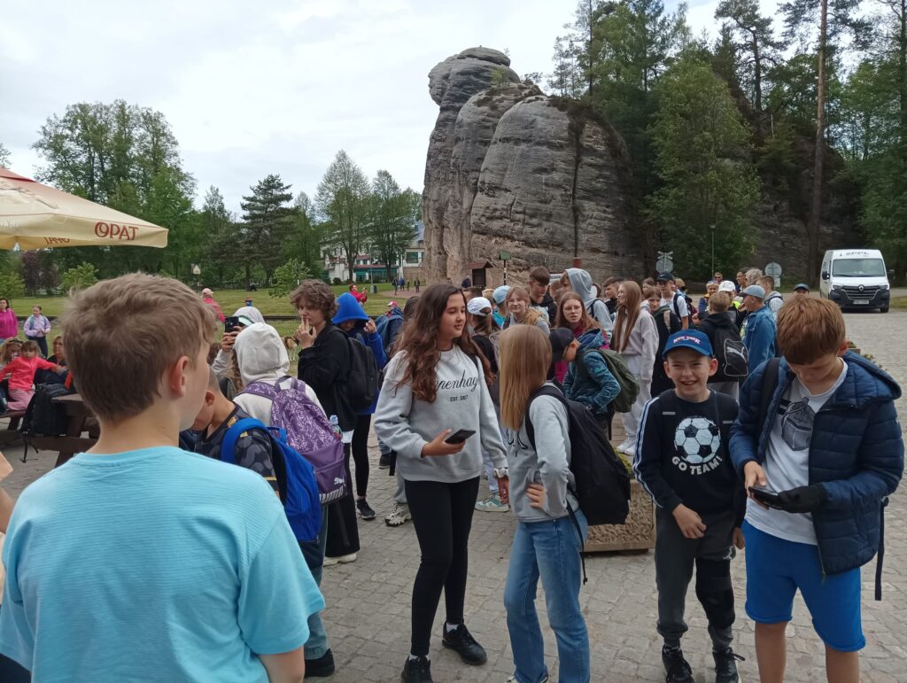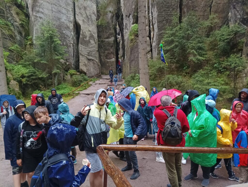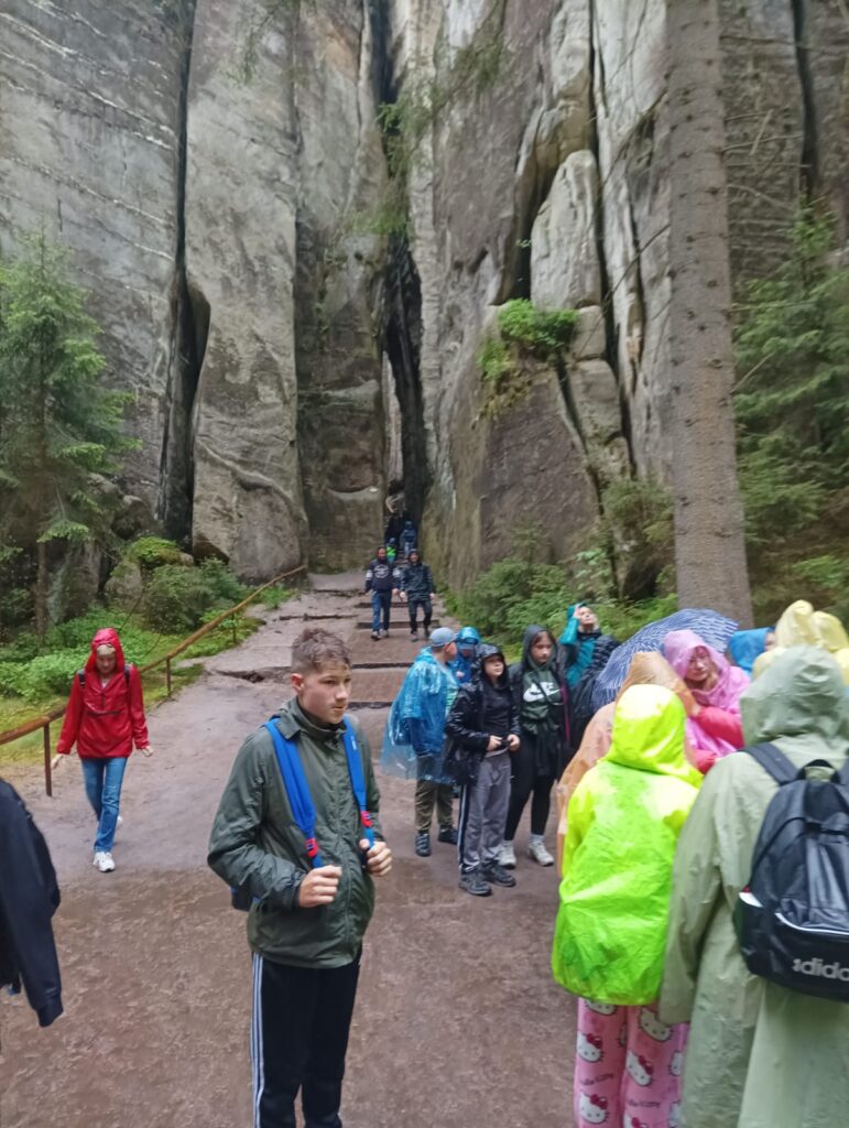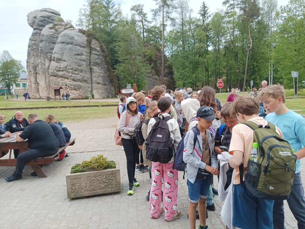 Po długich tygodniach nauki i ciężkich egzaminach ósmoklasisty, w piątek 17 maja 2024 roku wyruszyliśmy na upragnioną wycieczkę. Rano, z dobrymi humorami i dobrze zaopatrzonymi plecakami pomknęliśmy naszym autokarem w kierunku polsko – czeskiej granicy. Po około 3 godzinach jazdy dotarliśmy do celu naszej wycieczki – czeskiej miejscowości Adrspach. Na miejscu rozpoczęliśmy wędrówkę największym labiryntem skalnym w Czechach. Pogoda nam dopisywała, niestety tylko do pierwszego rozwidlenia szlaku. Nie zrażeni kroplami deszczu podziwialiśmy piękno formacji piaskowcowych, czystych strumyków i wodospadów. Przeciskając się wąskimi szczelinami skalnego labiryntu zachwycaliśmy się pięknem skalnych rzeźb. Zmęczeni i przemoczeni dotarliśmy do autokaru, w którym zorganizowaliśmy wielkie suszenie ubrań. Zwieńczeniem naszej wycieczki był obiad w McDonald.