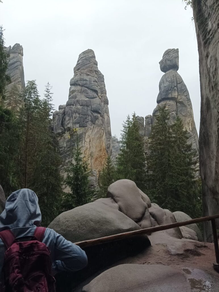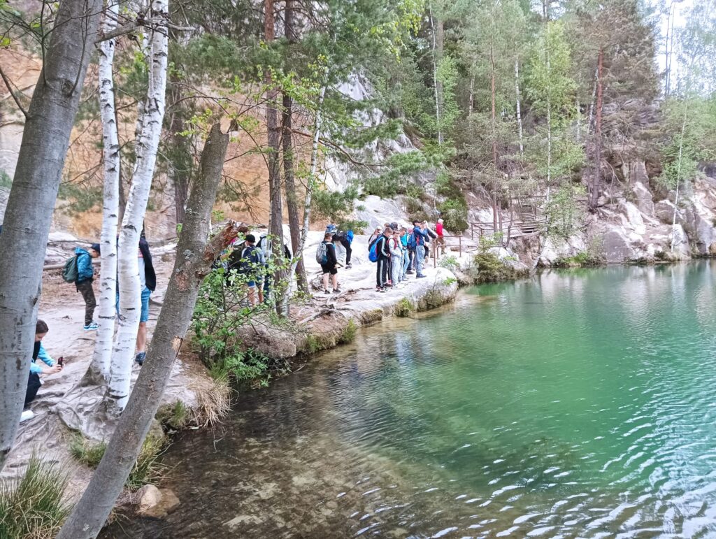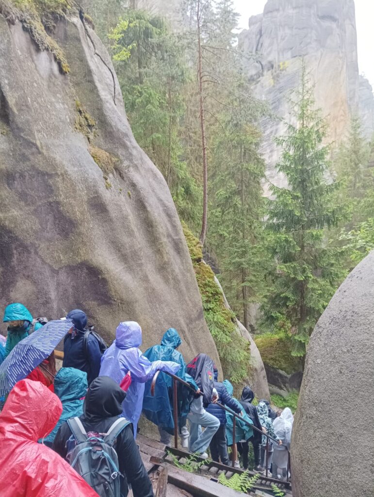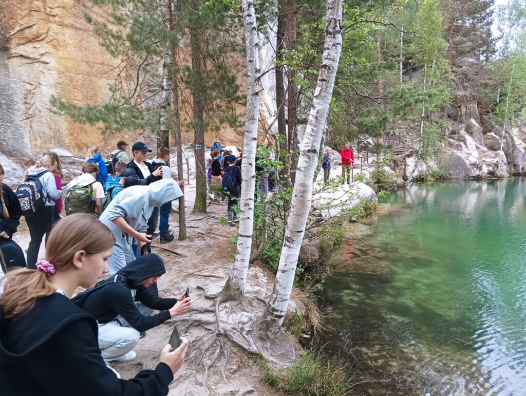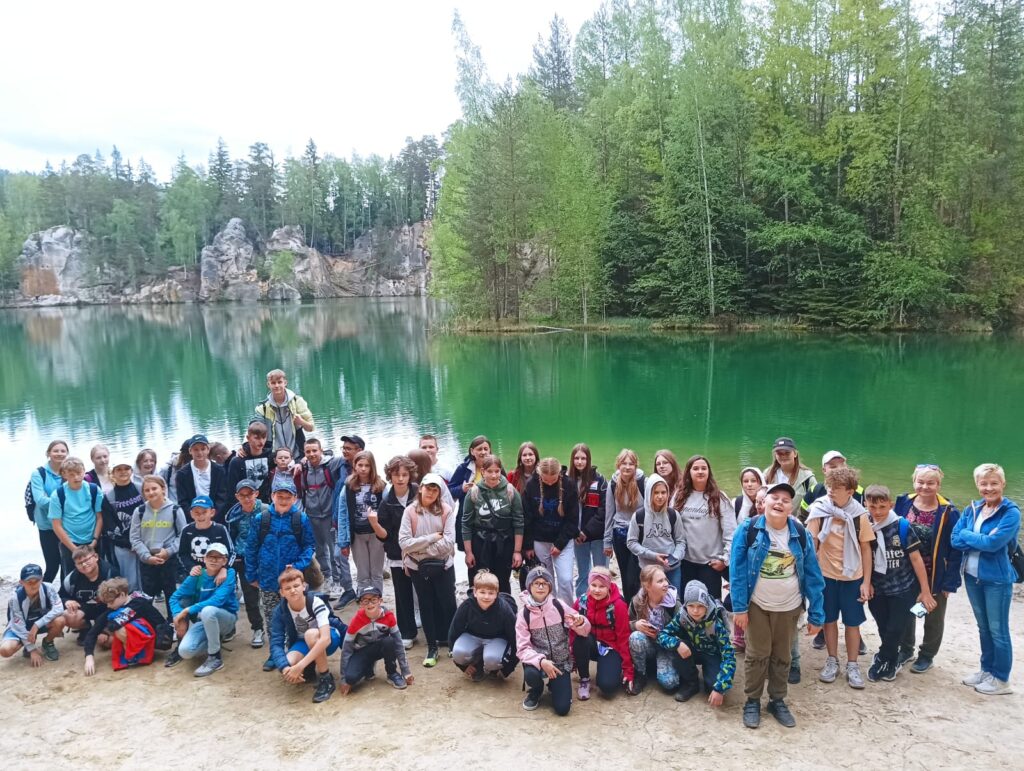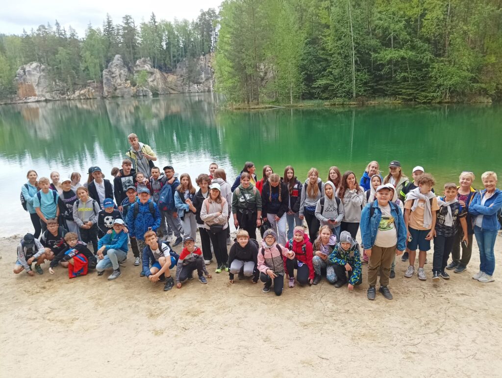 Po długich tygodniach nauki i ciężkich egzaminach ósmoklasisty, w piątek 17 maja 2024 roku wyruszyliśmy na upragnioną wycieczkę. Rano, z dobrymi humorami i dobrze zaopatrzonymi plecakami pomknęliśmy naszym autokarem w kierunku polsko – czeskiej granicy. Po około 3 godzinach jazdy dotarliśmy do celu naszej wycieczki – czeskiej miejscowości Adrspach. Na miejscu rozpoczęliśmy wędrówkę największym labiryntem skalnym w Czechach. Pogoda nam dopisywała, niestety tylko do pierwszego rozwidlenia szlaku. Nie zrażeni kroplami deszczu podziwialiśmy piękno formacji piaskowcowych, czystych strumyków i wodospadów. Przeciskając się wąskimi szczelinami skalnego labiryntu zachwycaliśmy się pięknem skalnych rzeźb. Zmęczeni i przemoczeni dotarliśmy do autokaru, w którym zorganizowaliśmy wielkie suszenie ubrań. Zwieńczeniem naszej wycieczki był obiad w McDonald.