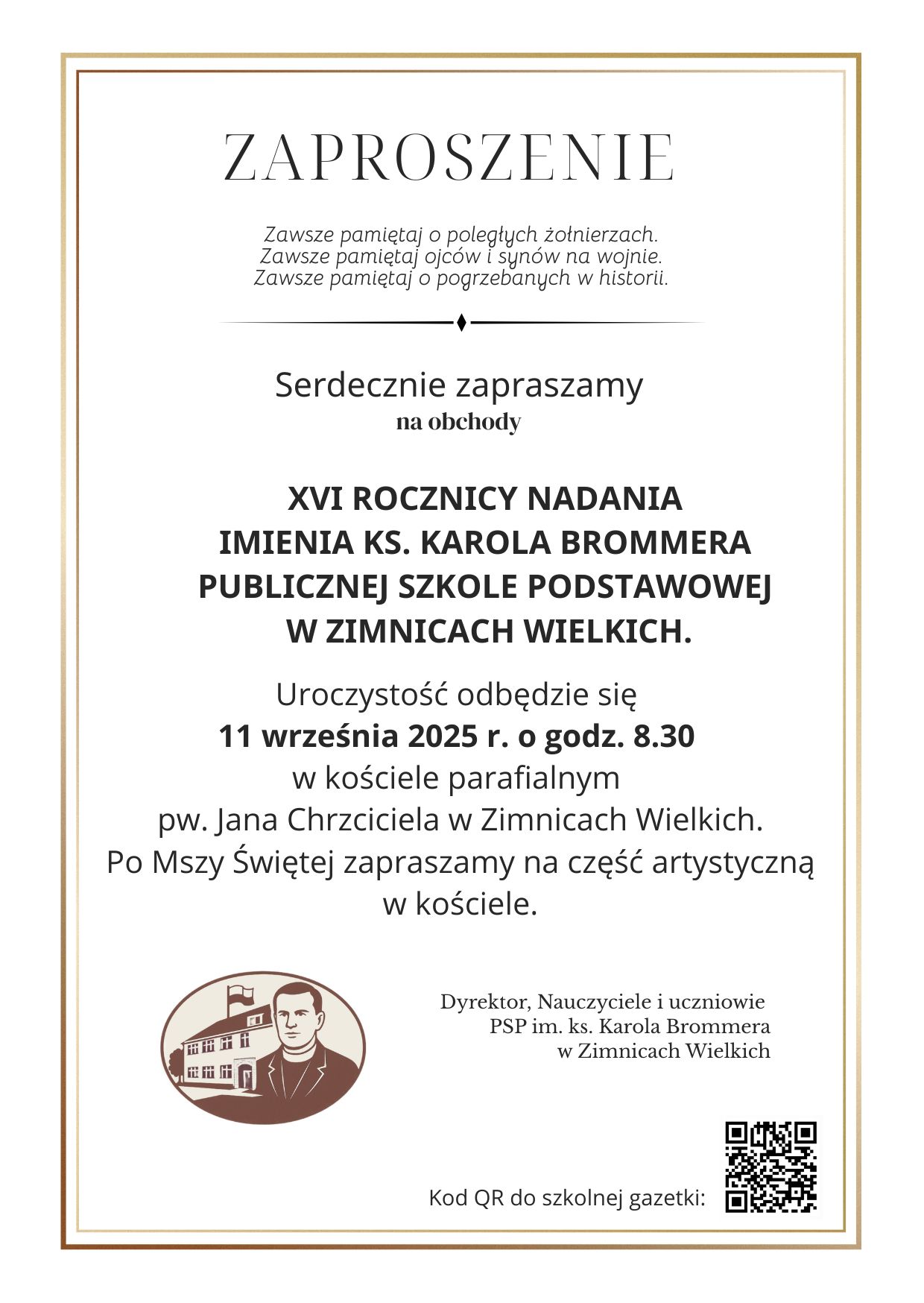 Odbędzie się ona w dniu 11 września (czwartek – uczniowie w strojach galowych) w naszej szkole w Zimnicach Wielkich. Po pierwszej lekcji wszyscy uczniowie wraz ze sztandarem i gośćmi udadzą się do kościoła parafialnego w Zimnicach Wielkich. O godzinie 8:30 odbędzie się Msza Święta z okazji XVI rocznicy nadania szkole w Zimnicach Wielkich imienia ks. Karola Brommera. Na mszy nastąpi poświęcenie tornistrów pierwszoklasistów. Po mszy w kościele będzie wspomnienie ks. Karola Brommera po którym udamy się na grób naszego patrona. Po złożeniu kwiatów i krótkiej modlitwie wracamy do szkoły aby na I piętrze uroczyście odsłonić pamiątkową tablicę nagrobną ks. Karola.